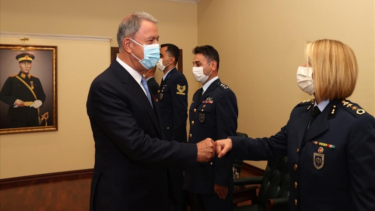 Bakanlıktaki kabulde konuşan Akar, kurulduğu günden bugüne kadar nitelikli personeli, modern teknolojisi ve üstün başarılarıyla asil milletinin daima gurur kaynağı olan Türk Hava Kuvvetlerinin kuruluşunun 110’uncu yılını kutladı. Akar, Türk Silahlı Kuvvetlerinin etkin, caydırıcı ve saygın niteliklerini sağlayan en önemli unsurlardan birinin Hava Kuvvetleri olduğunu vurgulayarak, hava kuvvetlerinin semaların korunmasından terörle mücadele harekatına, Doğu Akdeniz’deki hak, alaka ve menfaatlerin savunulmasından insani yardım faaliyetlerine kadar birçok alanda elde edilen başarılarda büyük pay sahibi olduğunu kaydetti. Bakan Akar, şunları söyledi: