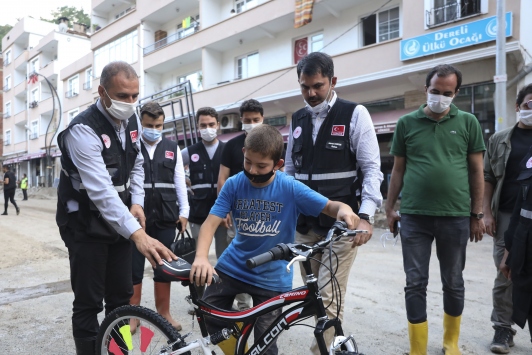 Çevre ve Şehircilik Bakanı Murat Kurum, Dereli ilçesindeki selde bisikleti kaybolan çocuğu yeni bir bisikletle sevindirdi.