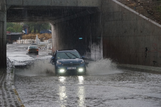 Çayiçi Caddesi'nden akan yağmur sularının dolduğu dükkanların sahipleri zor anlar yaşadı. Kapağı çıkan bir rögara lastiği giren araçta hasar oluştu.