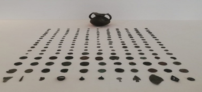 Ekiplerce takibe alınan şüphelilerin aracında yapılan aramada, 1 adet vazo ve 183 adet sikke ele geçirildi.