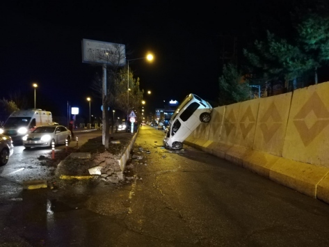 Çarpmanın etkisi ile takla atan araç, Şehit Hasan Gül Polis Merkezi önündeki beton bloklara çarparak durdu. Bloklara dayalı şekilde dik duran araç daha sonra çekici yardımıyla kaldırıldı.