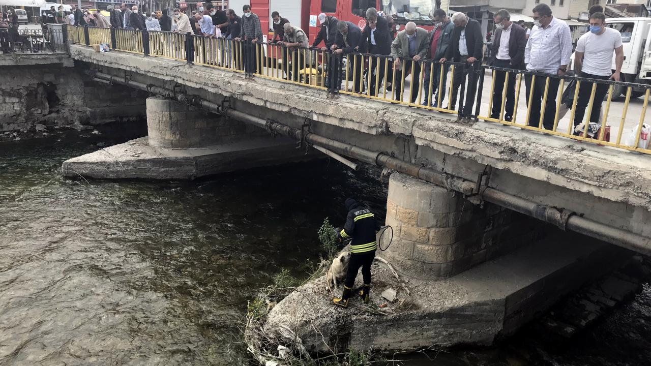 Olay yerine gelen itfaiye ekipleri, nehirdeki hayvanı yaptıkları çalışma ile kurtardı.