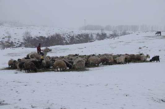 Sabah erken saatlerde kar altındaki ot ve samanı çuvallara doldurarak ezdikleri karın üstüne bırakan hayvan sahipleri, ağıllardan çıkardıkları küçükbaş hayvan sürüsünü burada besliyor.