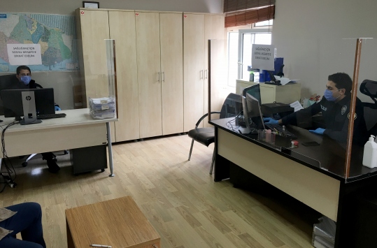 Ekiplerce camekanlara "sosyal mesafeyi koruyalım" yazılı afişler yapıştırılırken, gelen vatandaşlar için giriş ve çıkışa dezenfektan konuldu.