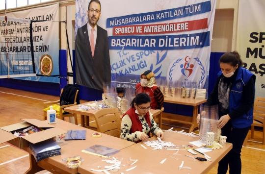 Gençlik ve Spor İl Müdürlüğü bünyesinde gençlerin ihtiyaçları çerçevesinde çalışmalar yapan gençlik liderleri ve dört antrenör, spor salonunda günlük 400'e yakın maske üretiyor.