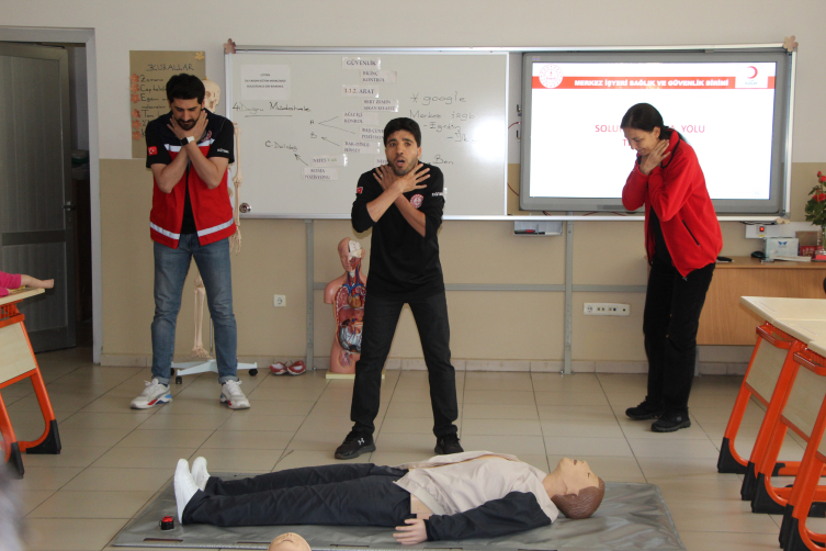 İlk yardım eğitiminin hayatının her alanında gerektiğinin altını çizen din kültürü ve ahlak bilgisi öğretmeni Bünyamin Bürkük, Heimlich manevrasının hayati önem taşıdığını söyledi.