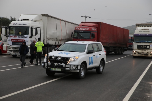 BM'nin yardımlarını taşıyan 33 tır, Hatay'ın Reyhanlı ilçesindeki Cilvegözü Sınır Kapısı'ndan geçiş yaptı.