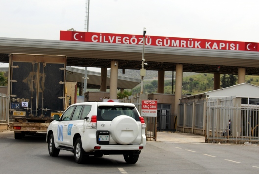 BM'nin yardımlarını taşıyan tırlar, Hatay'ın Reyhanlı ilçesindeki Cilvegözü Sınır Kapısı'ndan geçiş yaptı.
