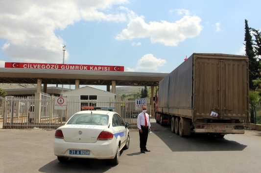 BM'nin yardımlarını taşıyan tırlar, Hatay'ın Reyhanlı ilçesindeki Cilvegözü Sınır Kapısı'ndan geçiş yaptı.