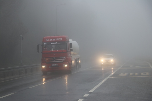 Kara yolunun Bolu Dağı geçişinde sağanak ve sis dolayısıyla görüş mesafesi yer yer 25 metreye kadar düştü.