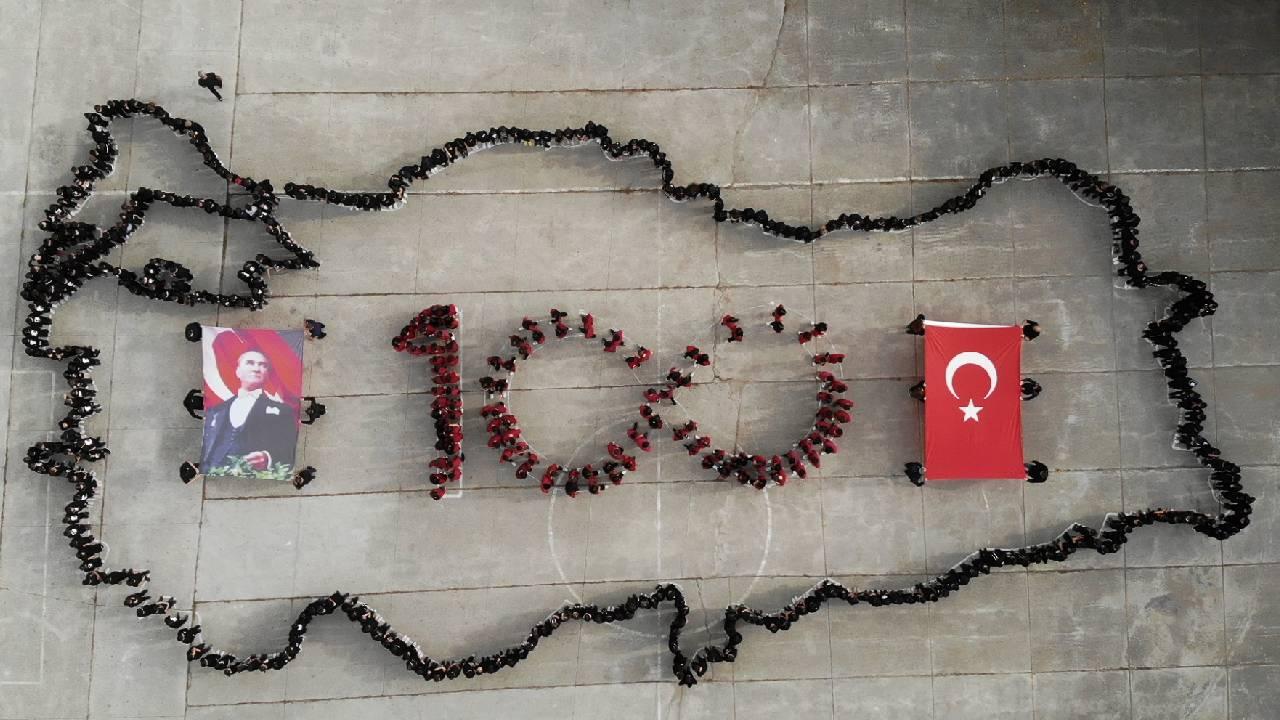 Okullarda eğitim gören 650 öğrenci, okul bahçesinde sıralanarak Türkiye haritasını oluşturdu. 52 öğretmen de haritanın içinde sıralanarak, Cumhuriyet'in 100'üncü yılını temsilen "100" yazdı.