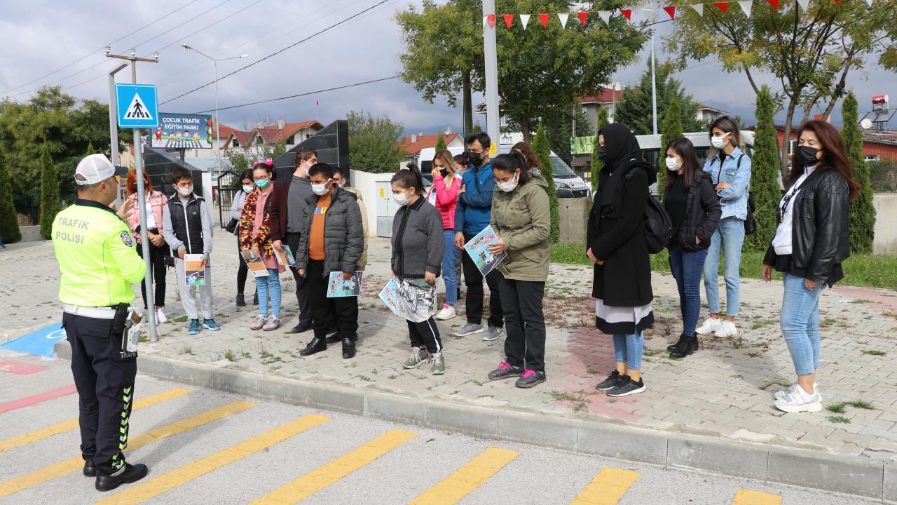 Yaya geçitlerinin dikkatli kullanılmasını isteyen ekipler, emniyet kemeri takılması ve servis araçlarından inerken dikkatli olunması konusunda öğrencileri uyardı.