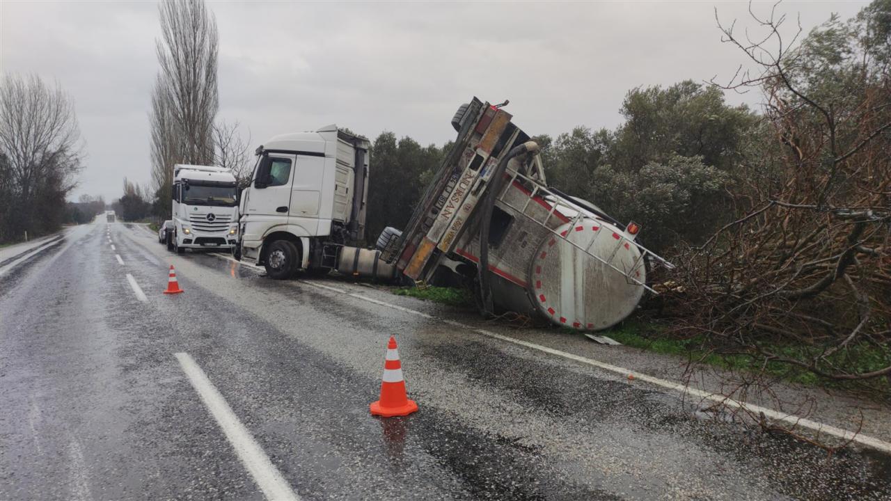 Orhangazi-İznik kara yolunda seyreden Tamer Gülçay idaresindeki tanker, Keramet Mahallesi kavşağı yakınlarında yol kenarındaki zeytinliğe devrildi.
