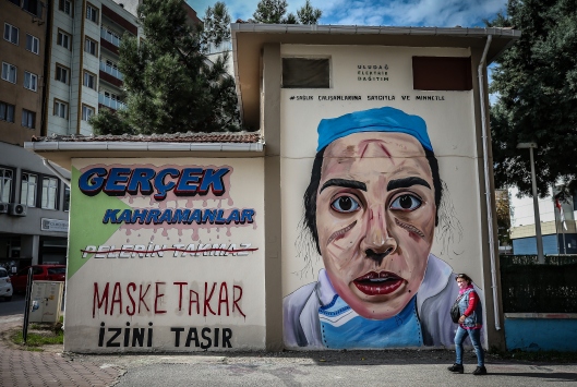 Bu kapsamda, Nilüfer içesindeki bazı trafolara, sağlık çalışanlarının, çalışırken taktıkları maske nedeniyle yaralar oluşan yüzlerinin resimleri yapıldı.