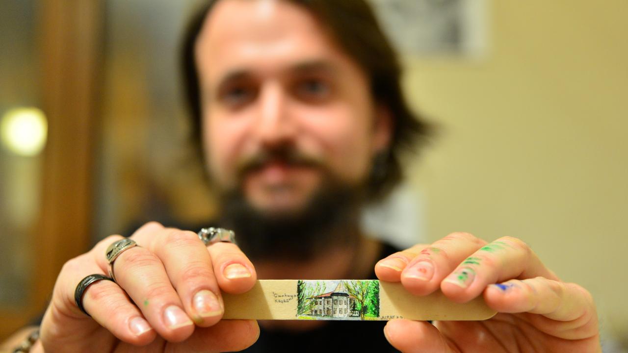 Çanakkale Onsekiz Mart Üniversitesi (ÇOMÜ) Tıp Fakültesi Hastanesi Beyin ve Sinir Cerrahisi Bölümü Araştırma Görevlisi Alpay Burak Doğru, pirinç ve incir çekirdeği, dil çubuğu, madeni para, hap ambalajı, kabak çekirdeği gibi objelere "büyüteçle görülebilen" resimler çiziyor.