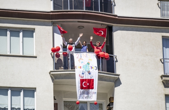 Beylikdüzü Mehmet Gesoğlu İlkokulu birinci sınıf öğrencileri, Kovid-19 önlemleri nedeniyle okullarında kutlayamadıkları 23 Nisan Ulusal Egemenlik ve Çocuk Bayramı'nı aileleriyle hazırladıkları afişler, balonlar ve bayraklarla balkonlarından ve pencerelerinden kutladı.