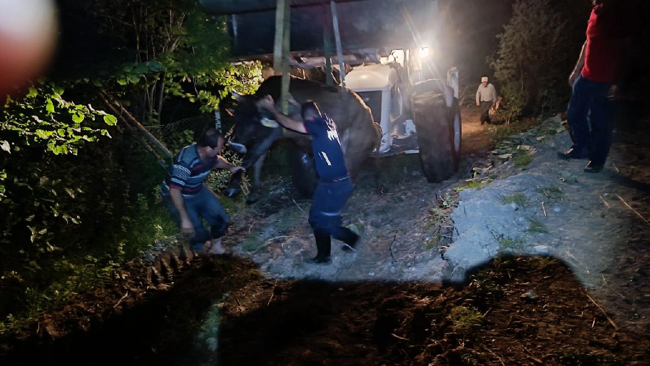 Çevredeki vatandaşlar, ineği dere yatağından çıkaramayınca 112 Acil Servis'ten yardım istedi.