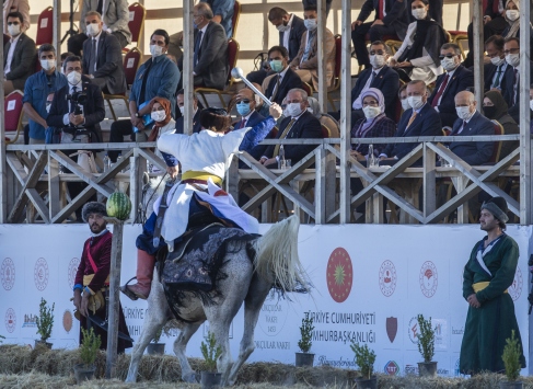 Daha sonra gösteri alanına geçen Erdoğan, Altay Atlı Okçuluk Kulübü'nün gösterilerini izledi.