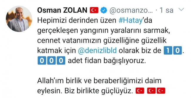 Zolan, "Hatay'da gerçekleşen yangının yaralarını sarmak, cennet vatanımızın güzelliğine güzellik katmak için Denizli Büyükşehir Belediyesi olarak biz de 10 bin adet fidan bağışlıyoruz. Allah'ım birlik ve beraberliğimizi daim eylesin. Biz birlikte güçlüyüz." ifadelerini kullandı.