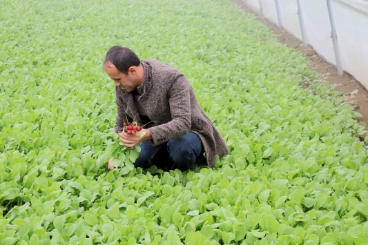 Plastik tünel şeklindeki seralarda paslanmaya karşı galvanizli malzemeler kullanan Yıldız, iklim koşullarına göre yaz döneminde domates salatalık, ilk ve sonbaharda ise turp, tere, roka ve marul yetiştiriyor.