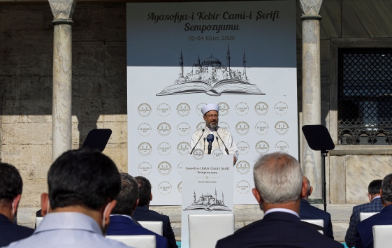 Camiler ve Din Görevlileri Haftası'nda, Ayasofya'nın mana ve önemini anlamaya katkı sunmak, medeniyet müktesebatındaki mümtaz konumunu ve gelecek perspektifine dair katkılarını müzakere etmek amacıyla bu etkinliği gerçekleştirdiklerini ifade eden Erbaş, sempozyumun hayırlı olması temennisinde bulundu.