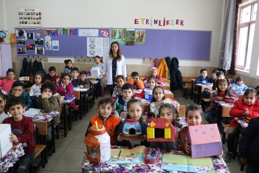 Öğrenciler öğretmenler gözetiminde deterjan kutuları, plastik kova, bidon ve karton gibi atıklardan kuş yuvası ve yemlik yaptı.