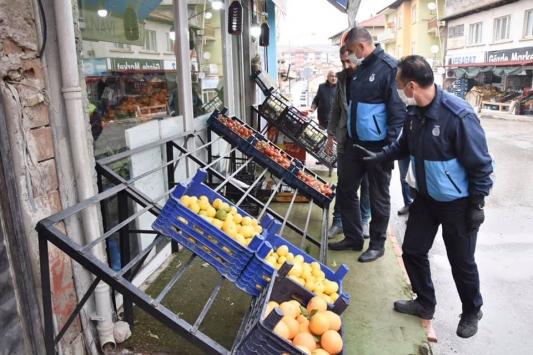 Kaldırımların boşaltılmasını isteyen zabıta ekipleri, esnafa sosyal mesafe hakkında bilgilendirme yaptı.