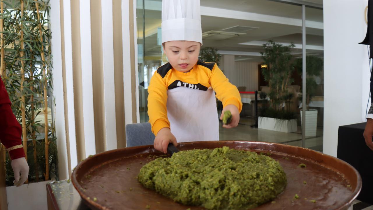 Çocuklar, daha sonra etkinlik için özel olarak hazırlanan önlüklerini giyip şapkalarını takarak kentin en önemli lezzetlerinden olan tescilli cennet çamuru tatlısını yaptı, gün dolayısıyla hazırlanan pastanın üzerindeki mumları üfledi.