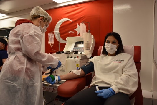 Türk Kızılay Doğu Karadeniz Bölge Kan Merkezinin Ortahisar ilçesindeki Atatürk Alanı'nda konuşlanan İmmün Plazma Bağış Aracı'na gelerek bağışta bulunan babası ve kardeşine, Busenaz destek verdi.