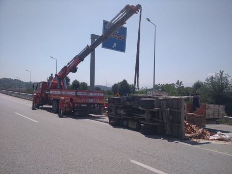 Düzce'de alınan bilgiye göre, Kuzey Çevre Bağlantı Yolunda Bahçeşehir yönüne seyreden A.Y. idaresindeki 34 BBU 39 plakalı tuğla yüklü kamyonet, sürücüsünün direksiyon hakimiyetini kaybetmesi sonucu devrildi.