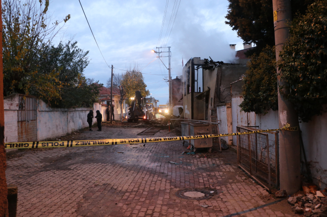 [Fotoğraf: AA]İtfaiye ekiplerinin çalışmasının ardından söndürülen yangında binanın çatısı ve duvarları yola devrildi.