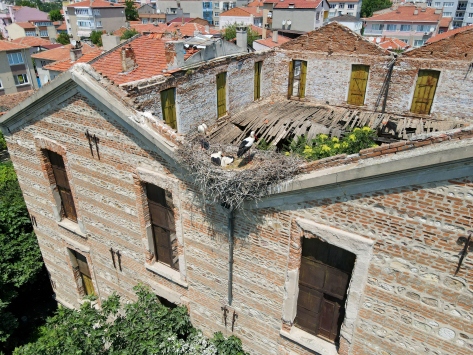 Mahalle sakinlerinden Uğur Doyran, tarihi binanın çatısında yer alan yuvada, her yıl 2-3 yavru leyleğin büyüdüğünü söyledi.