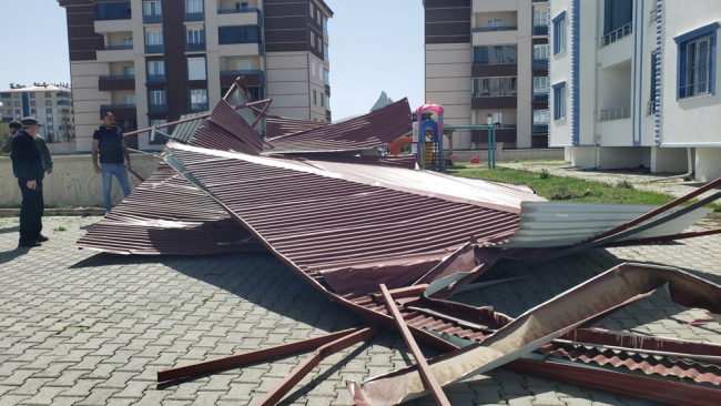 Yere düşen çatı parçaları park halindeki 3 araca hasar verdi.