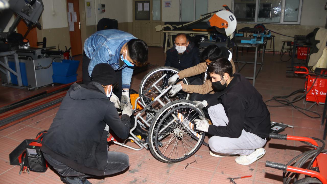 Yanlarındaki malzemelerle kırılan ya da eskiyen tekerlekli sandalyeleri onaran öğrenciler, evde tamir edilmesi mümkün olmayan sandalyeleri de okulun atölyesine götürüyor.