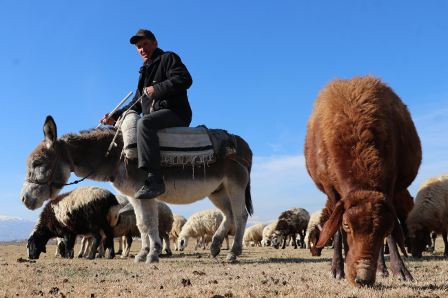 Çocuk yaşlarda başladığı çobanlığı 50 yıldır sürdürerek geçimini sağlayan Koyun, her gün eşek sırtında ya da yürüyerek kilometrelerce yol katediyor.
