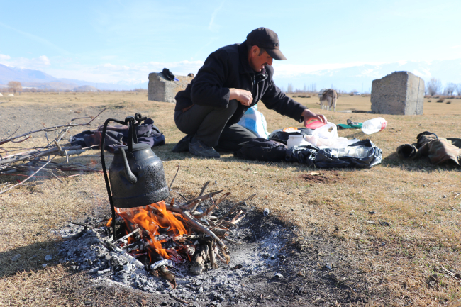 Odun ateşinde demlediği çayla ısınmaya çalışan Koyun, sağlığı el verdiği sürece hayvancılık faaliyetlerine devam etmek istiyor.