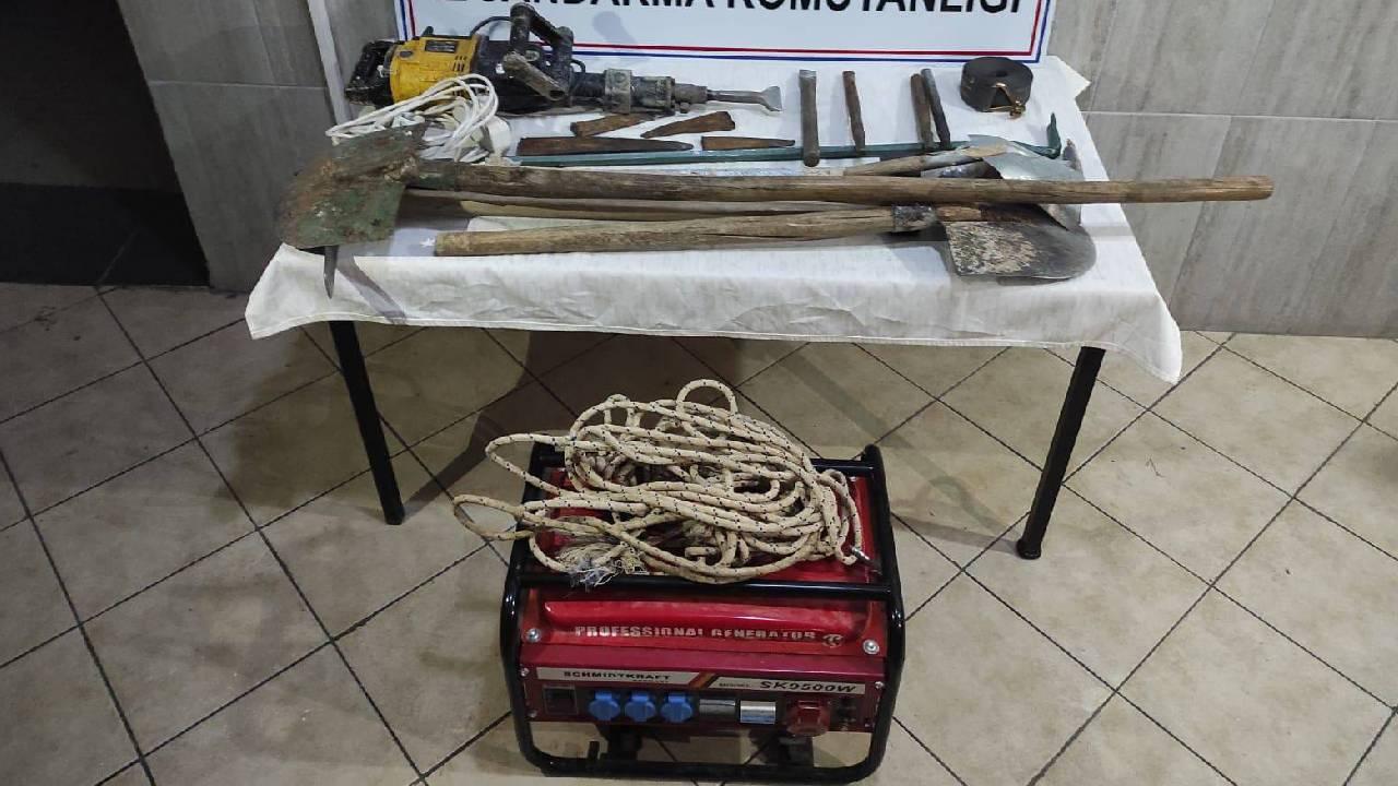 Olay yerinde jeneratör, kırıcı delici, 3 kürek, balyoz, manivela demiri ve çeşitli kazı malzemeleri ele geçirildi.