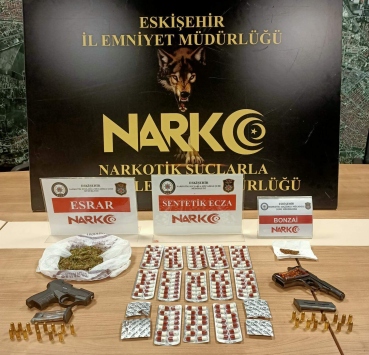 Zanlının üst aramasında ve evinde 204 sentetik hap, 42,88 gram esrar, 2,19 gram sentetik kannabinoid ve 2 tabanca ele geçirildi.