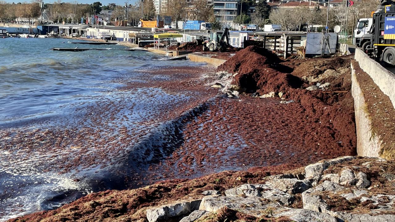 Lodos fırtınası sonrasında dalgalarla karaya taşınan kırmızı yosunlar, Caddebostan sahilini kapladı.