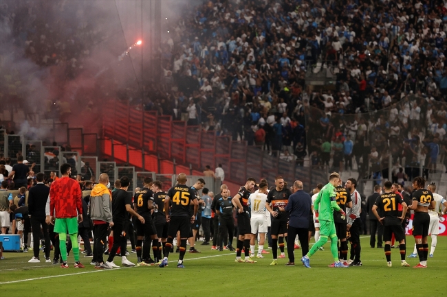 Karşılaşma, Galatasaray taraftarlarının bulunduğu tribünlerden atılan yabancı maddeler nedeniyle 38. dakikada hakem Alejandro Hernandez tarafından durduruldu.
