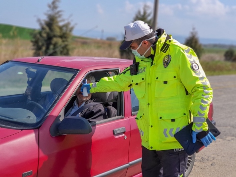 Kontrol noktasında ekipler tarafından sürücü ve yolcuların sağlık durumlarını tespit etmek amacıyla ateş ölçümünün yapıldığı uygulamada, polisler bir yandan da sürücüleri uyarılar yapıp, ellerindeki dövizlerle, "Sen Bize Bakma, Evde Kal Türkiye" mesajı veriyor.