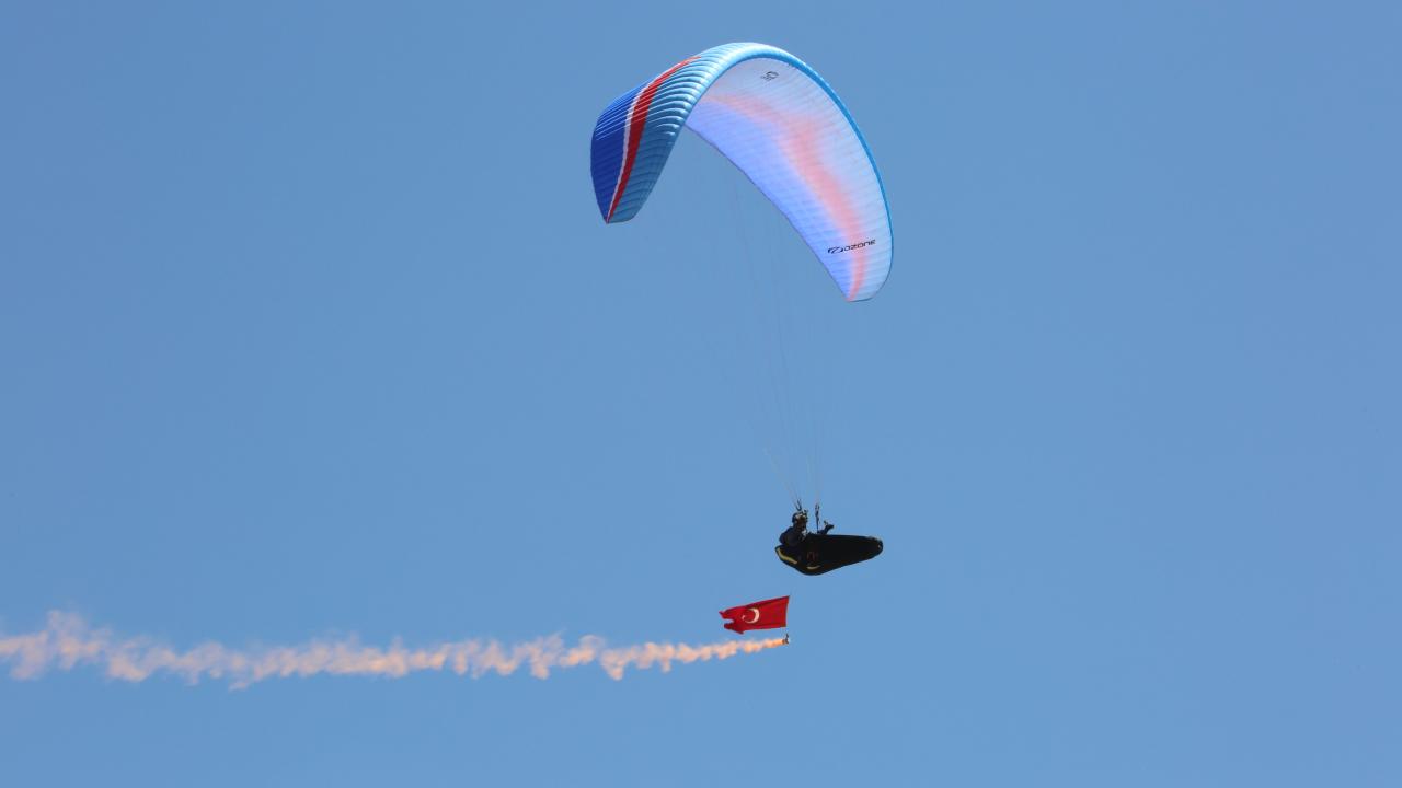 Toroslardan atlayış yapan yamaç paraşütü pilotları, gökyüzünde Türk bayrağı ve Atatürk posteri açarak 30 Ağustos Zafer Bayramı'nı kutladı.