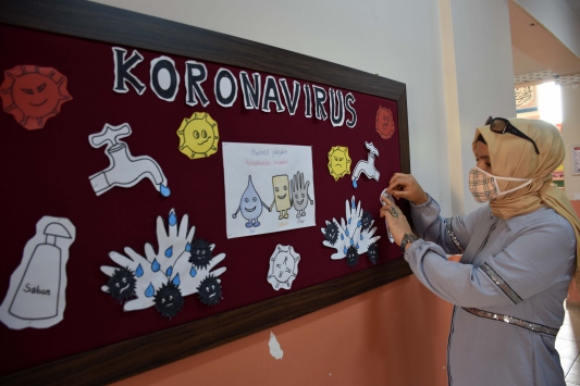 Okulun koridorlarını yıkayan ve sınıfları dezenfekte eden öğretmenler, sınıf ve koridorlara sosyal mesafe, maske ve hijyen kurallarının hatırlatıldığı Kovid-19 uyarıcı levhaları astı.