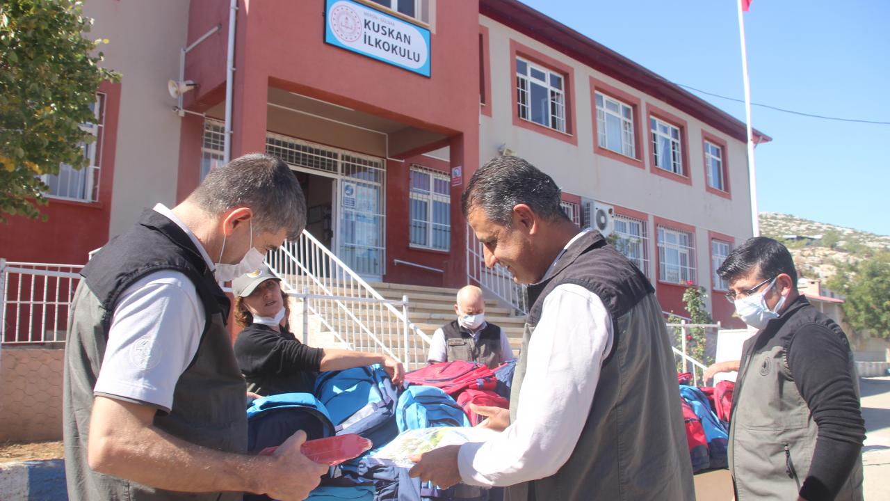 Kuskan İlköğretim Okulu'ndaki dağıtım töreninde, 1. ve 2. sınıf öğrencilerine okul çantaları hediye edildi.