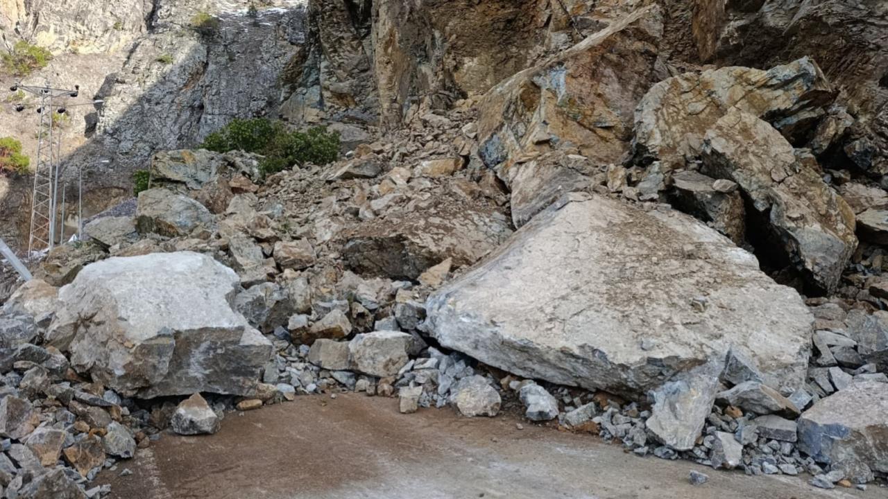 Kürtün ilçesi Özkürtün Tüneli girişi Pamuklu mevkiinde yamaçtan kopan toprak ve kaya parçaları karayolunu tamamen kapattı.