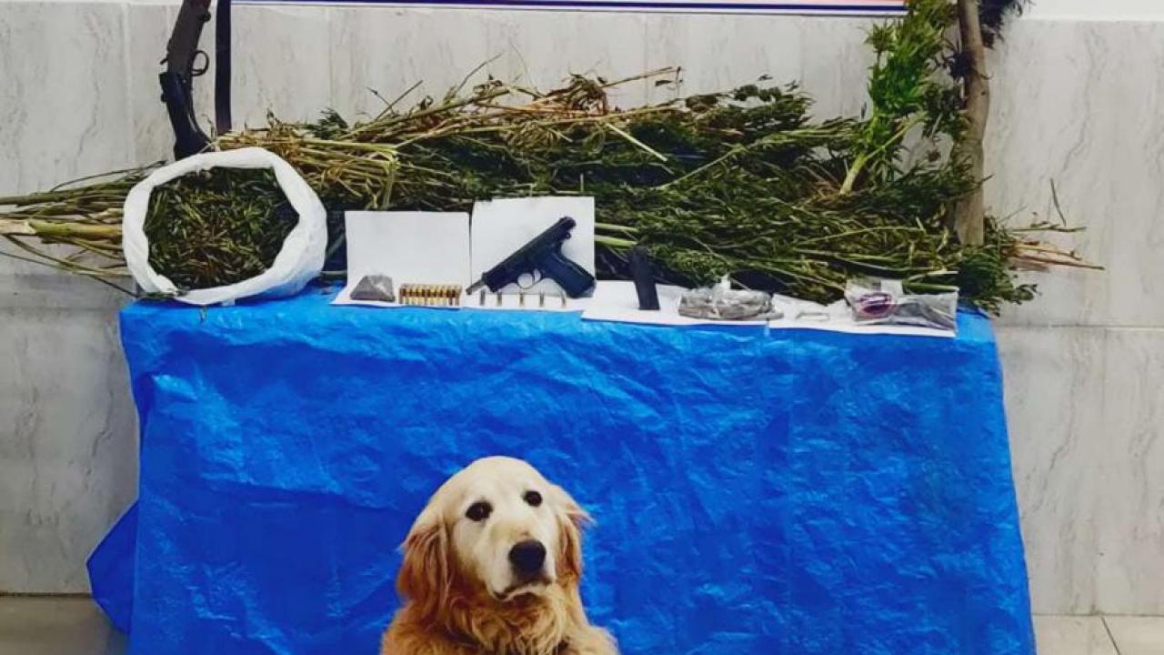 Narkotik köpeği "Altın" ile E.Z'nin evi ve bahçesinde yapılan aramada, 4 kilo 755 gram kubar esrar, 2 kök skank bitkisi, 9 milimetre tabanca, 2 yivsiz av tüfeği, muhtelif çap ve miktarda tabanca ve tüfek mühimmatı ele geçirildi.