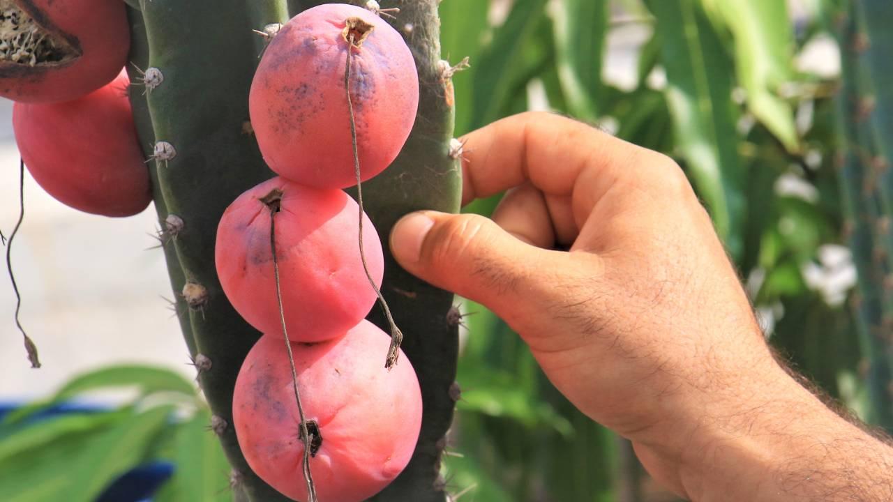 "Hint incirinde meyveler çok dikenli oluyor. İşçilik ve özellikle hasatta bazı sıkıntılar yaşanabiliyor. Bu deneme parselinde iki çeşit Peru elması var. Bir tanesi dikenli olan ama dikenler sadece anaç gövdede, meyvede diken yok. Dolayısıyla hasadı kolay ve zahmetsiz olacak. Meyve aroma olarak Hint incirine göre daha lezzetli, çekirdeği var ama tüketim esnasında onu hissedemiyorsunuz."