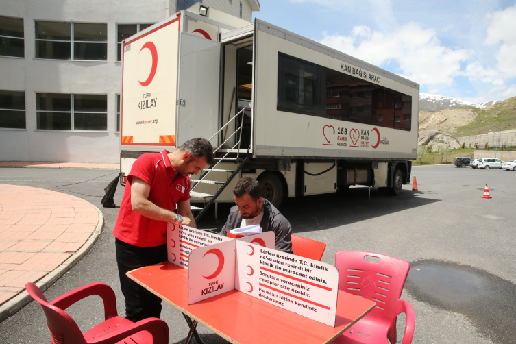 Kampanya kapsamında Hakkari Üniversitesi Zeynel Bey Yerleşkesine konuşlanan kan bağış tırına gelen öğrenciler, bağışta bulundu.