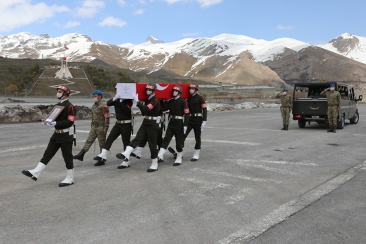 Hakkari Dağ ve Komando Tugay Komutanlığında yeni tip koronavirüs (Kovid-19) tedbirleri uygulanarak gerçekleştirilen törende şehit Piyade Er Abdullah Çam'ın Türk bayrağına sarılı naaşı alana getirildi.