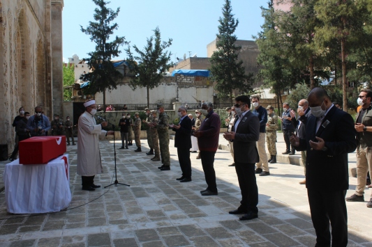 Kızıltepe ilçesinde Ulu Cami'de yeni tip koronavirüs (Kovid-19) tedbirleri uygulanarak gerçekleştirilen törende şehidin ailesi tabuta sarılarak gözyaşı döktü.